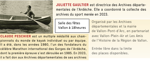 Organisé conjointement par les Archives Départementales, la mairie de Vallon, en partenariat avec le Vallon-Plein-Air et les Amis de l’Histoire, Hervé Ozil qui avait édité le livre de Claude Peschier « Eaux Vives d’Ardèche », en a présenté des clichés historiques. Les commentaires croisés de Claude Peschier et les éclairages de Juliette Gaultier sur la grande campagne de collecte par les Archives départementales des documents concernant le sport, ont été très enrichissants.