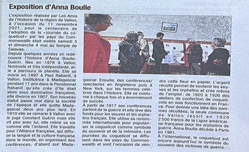 L’exposition réalisée par les Amis de l’histoire de la région de Vallon à l’occasion du 11 novembre 2021 pour le centenaire de l’adoption de la journée du coquelicot, était visible , samedi 3 et dimanche 4 mai au temple de Salavas. Depuis quelques années, on redécouvre l’histoire d’Anna Boulle-Guérin. Née en 1878à Vallon, féministe et très indépendante, elle a parcouru la planète pour récolter des fonds en »Amérique », en vendant des coquelicots en soie, fabriqués en France et en Angleterre, pour aider les victimes de la première guerre mondiale.